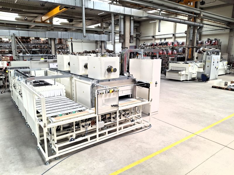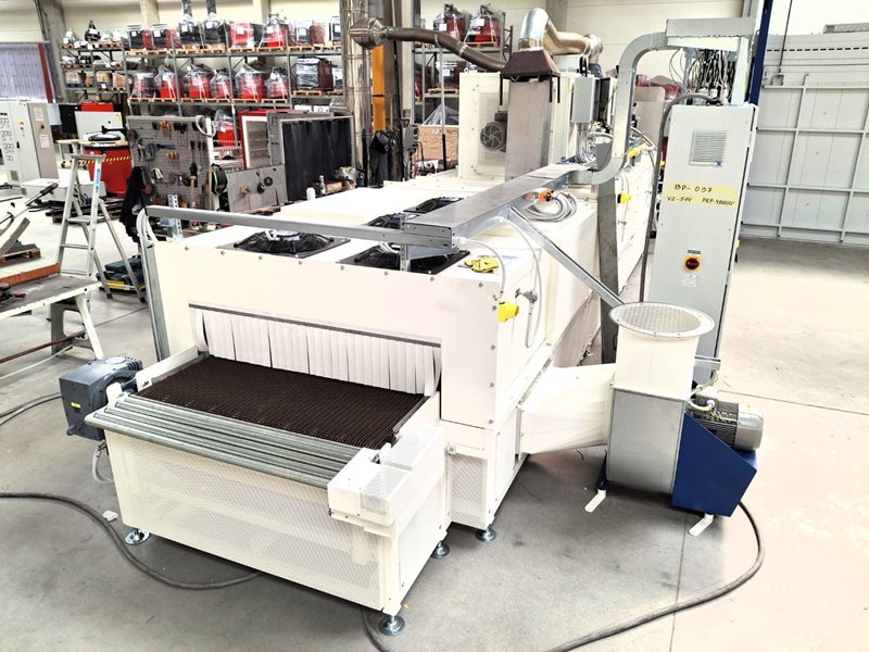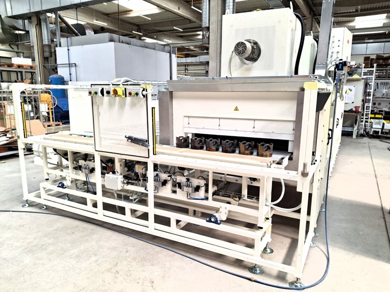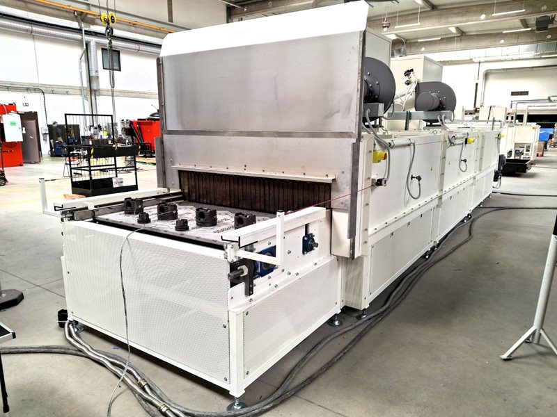 The second furnace delivered is the PR 4800 type with a working temperature of up to 650 °C. This is also a continuous furnace and is designed for annealing steel pistons after friction welding. This furnace is equipped with gas heating and a belt conveyor along which the charge passes. The furnace has forced air circulation, a preheating chamber, a tempering chamber and a cooling chamber.