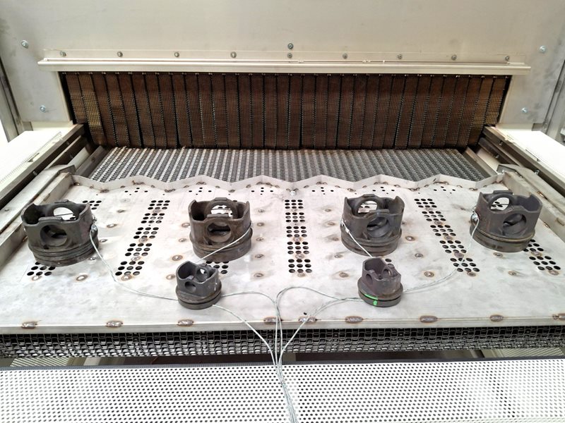 We have already designed and delivered a number of furnaces in several designs for the thermal process of hardening the graphite layer around the circumference of automotive pistons with a processing temperature of up to 250 °C. We have now put into use the SP 2500 furnace designed for robust truck pistons. It is an electric furnace divided into multiple heating zones with a chain conveyor and pallets for storing the charge. It also includes a cooling tunnel and a special manipulator for easy and quick transfer of pistons between the heating part of the furnace and the cooling tunnel.